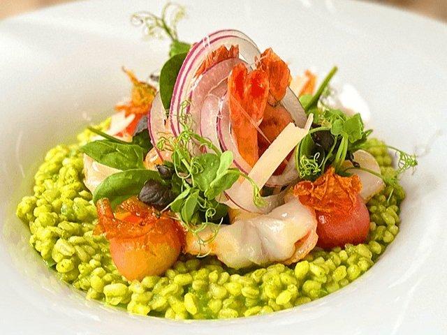 Krustentier-Zartweizenrisotto | Petersilienpesto | Getrocknete Tomaten |